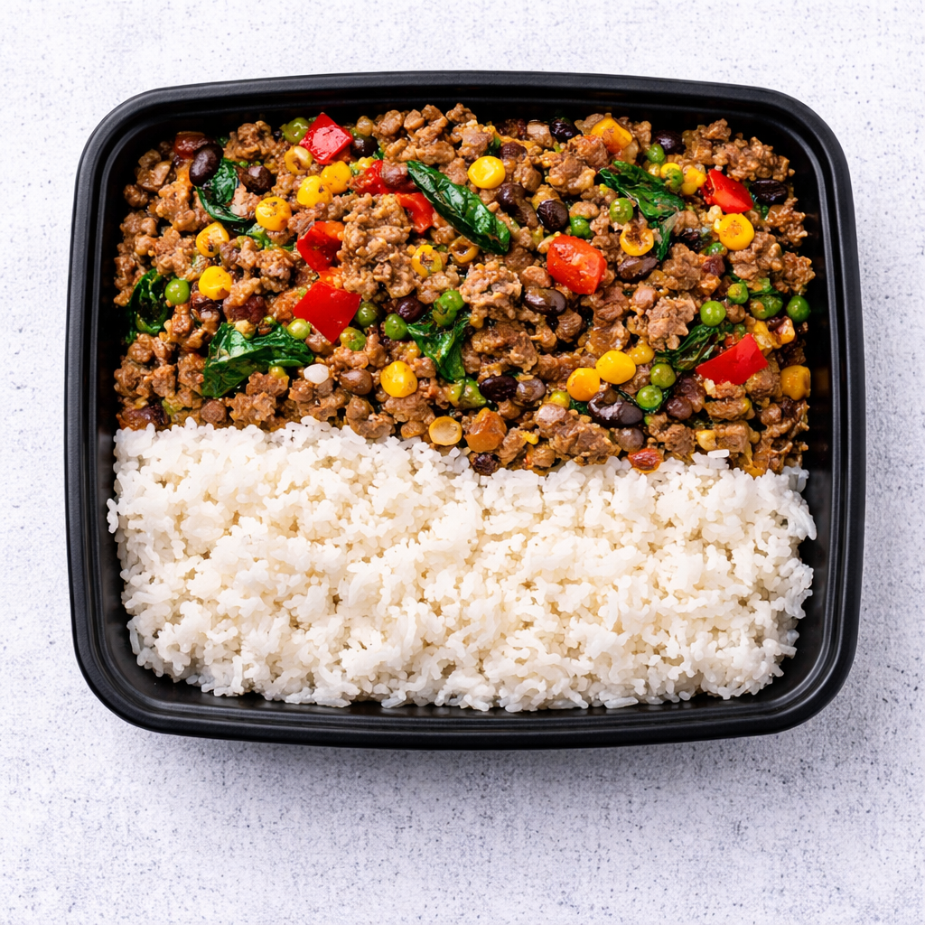 Ground Beef, Red Peppers, Spinach, Peas, Onions, Corn, Beans, Tomatoes, White Rice, Olive Oil, Garlic