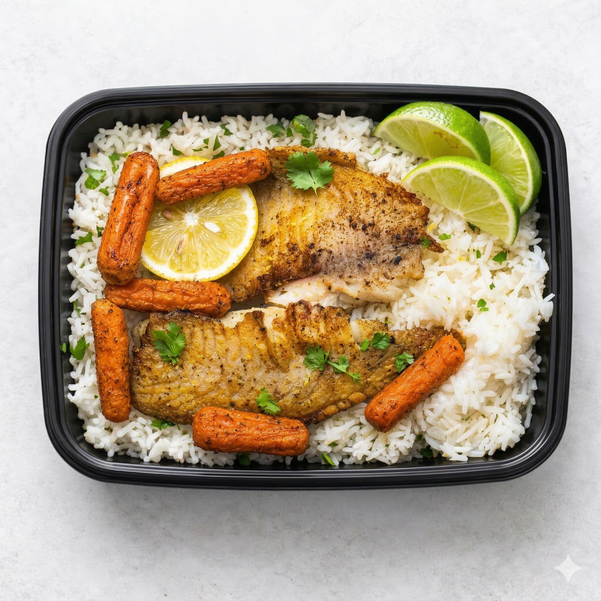 Flaky lemon-pepper tilapia served with roasted carrots and fluffy white rice.