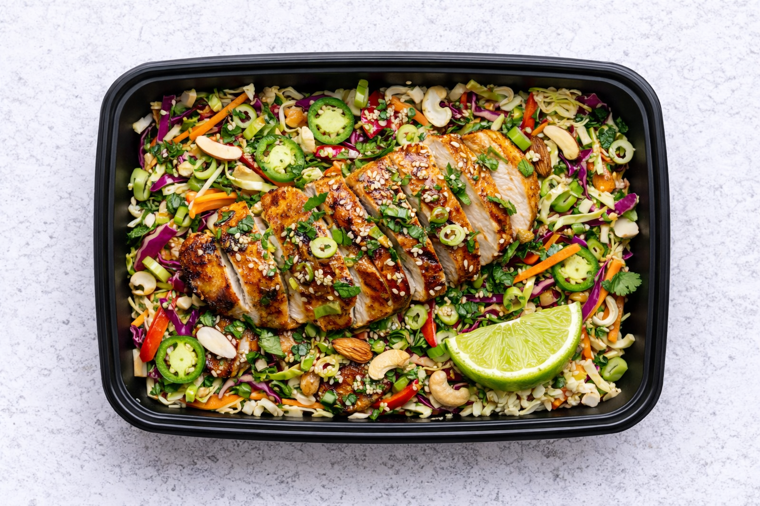 Chicken Breast, Sweet Potatoes, Green cabbage, Red cabbage, Carrots, Cilantro, Green onions, Jalapeno, Ginger, Sesame seeds, Almonds, Olive oil, Soy Sauce